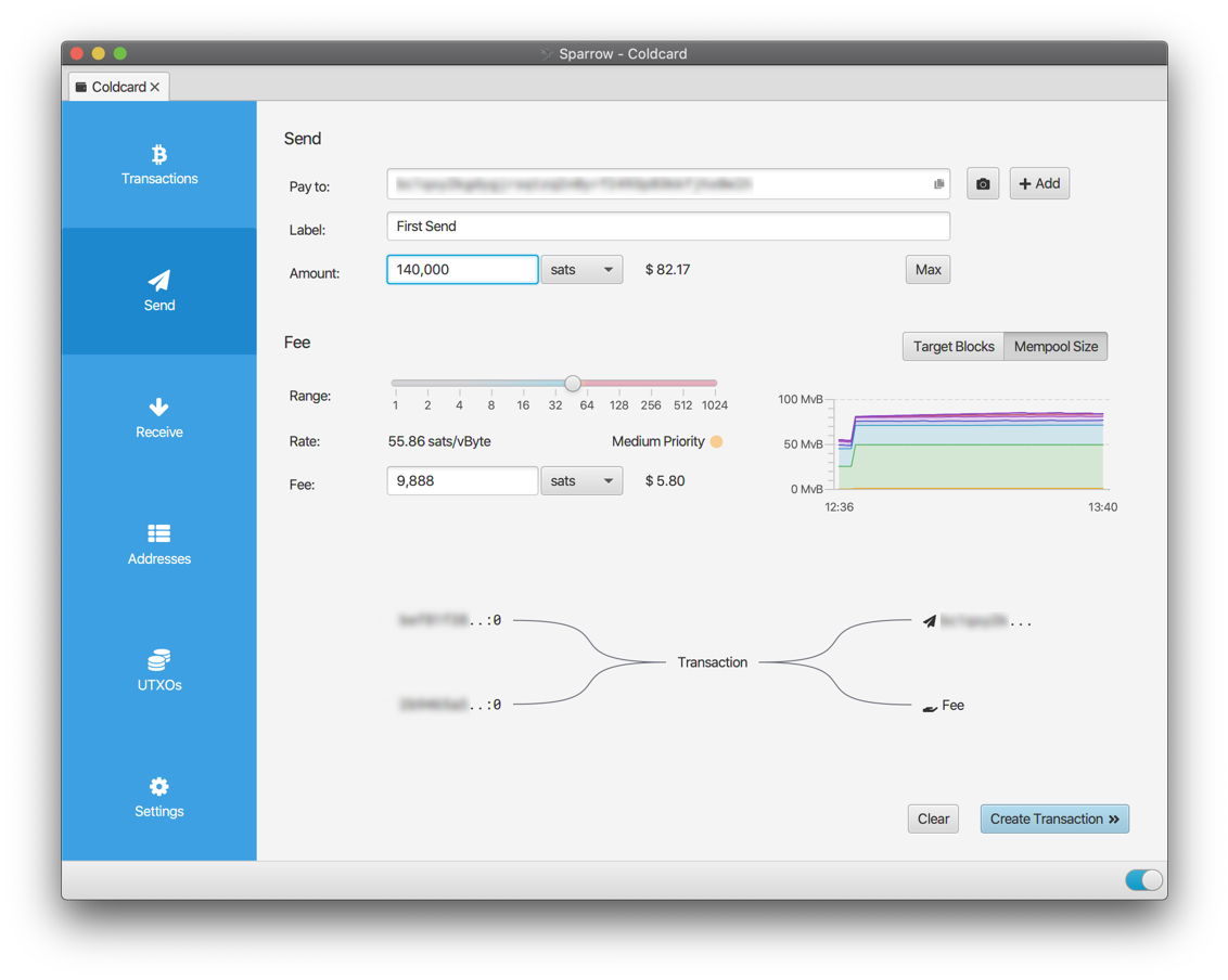 - Send: pick the UTXOs you want to spend from the UTXOs tab (this is coin control, an underrated privacy tool), draft the transaction, and let your hardware wallet sign it. Sparrow shows the exact bytes the device will sign, every fee, and every change output. Nothing is hidden.